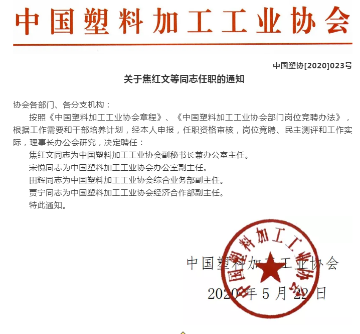 焦紅文同志為中國塑料加工工業(yè)協(xié)會副秘書長兼辦公室主任。